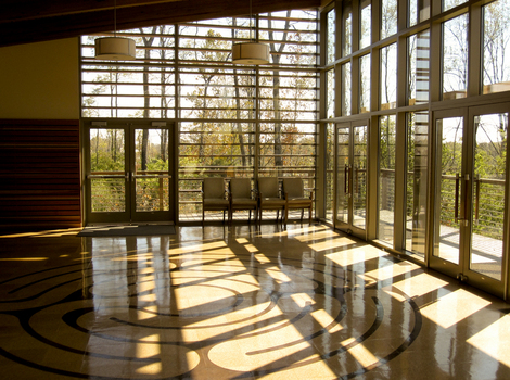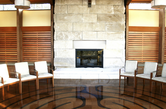 1. Gathering Room. The light-filled Gathering Room anchors the facility and serves as a space for small group gatherings, yoga classes, poetry readings and small musical recitals. The room includes a labyrinth and a fireplace.
