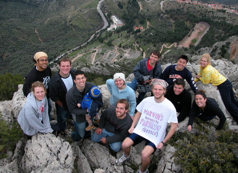 After an arduous hike up the steep slopes of Mt. Parnassos, DePauw students perch 800 feet above Apollo's marble shrine and ponder the whim of the gods while yearning for some hometown Marvin's goodness.