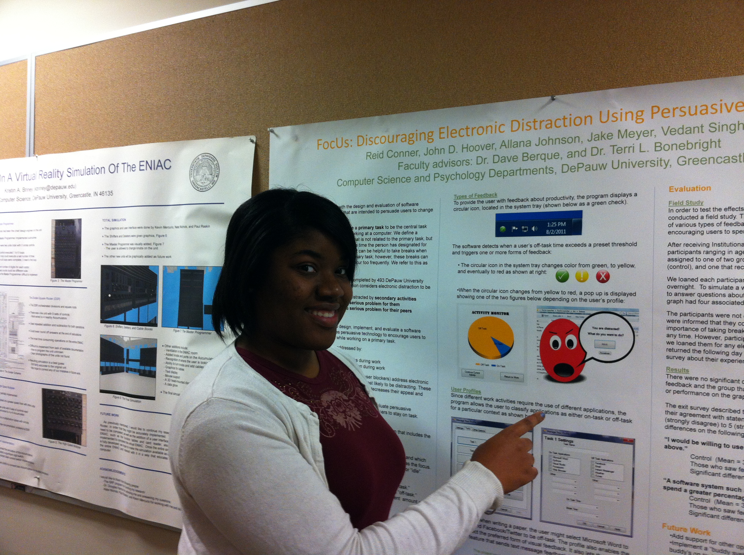 Allana completed the research described in this poster during the summer of 2011 with funding from the DePauw University Science Research Fellows Program. Additional DePauw students working on this project were Reid Connor, J.D. Hoover, Jake Meyer and Vedant Singhania. J.D. was also sponsored by the Science Research Fellows Program, Jake and Reid were sponsored by DePauw’s National Science Foundation Research Experiences for Undergraduates grant, and Vedant was sponsored by the DePauw University ITAP program. The students were mentored by an interdisciplinary team of faculty members consisting of Dave Berque (Computer Science), Terri Bonebright (Psychology) and Michael Roberts (Psychology).