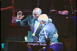 [DOWNLOAD AUDIO: "Accepts Award" 94KB] "I thank you for this precious and memorable moment in my life," Vernon Jordan told delegates to the National Association for the Advancement of Colored People Convention, as he accepted the 86th Spingarn Medal, the NAACP's highest honor for achievement. In his powerful address, delivered in New Orleans tonight, the 1957 DePauw University graduate and Trustee traced the path from his boyhood in Atlanta, to becoming a leading figure in the civil rights movement.