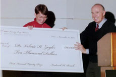 December 5, 2002, Greencastle, Ind. - Valarie H. Ziegler, Professor of Religious Studies at DePauw University, received the inaugural Trinity Prize at the joint annual meeting of the American Academy of Religion and Society of Biblical Literature, November 23-26 in Toronto, Ontario. The Trinity Prize, awarded by Trinity Press International, recognizes a writer or scholar whose cross-disciplinary writing has broad application for a general audience. Dr. Ziegler was honored for her new biography of Julia Ward Howe, which will be published in the fall of 2003. (Ziegler is seen in the accompanying photo with the Rt. Rev. Frederick Houk Borsch, former Episcopal Bishop of Los Angeles)