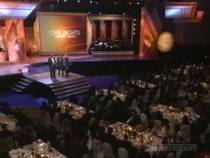 [DOWNLOAD AUDIO: "Standing on Shoulders" 179KB] "I stand on a lot of shoulders -- a lot of people who went with me, stood by me and propped me up on every weak and leaning side. And so for them -- family, friends, co-workers -- I share this award, and thank you, and it's great to be back home in Atlanta."