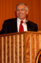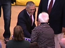 [DOWNLOAD VIDEO: "I Won't Forget Greencastle" 660KB]Wesley Clark's day at DePauw included a dinner at the home of Dr. Bottoms, which was attended by alumni and friends of DePauw. After the Ubben Lecture, General Clark joined Ken Bode, Eugene S. Pulliam Distinguished Professor of Journalism, and about 200 students for a forum in Thompson Recital Hall of the Performing Arts Center.