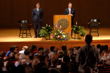 [DOWNLOAD AUDIO: "Inevitability" 481KB] "The question is, we've been hit once, will we be hit again?," former U.S. Secretary of Defense William S. Cohen asked DePauw University students, faculty, alumni and others tonight. "The answer is, it's almost inevitable... if you look at the probabilities [and] the vulnerabilities and you start having a metric examination of what those probabilities are, you have to say in all probability we'll get hit again because we're so open, because we don't have the discipline, the rigidity of an autocratic state... an authoritarian government. We are -- quote -- a democracy, with all its great strengths, but all of its great weaknesses. And so we're trying to prepare ourselves for this inevitability."