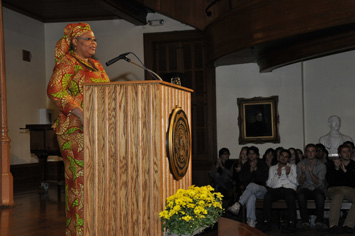 "Dedicating your life to peace is one of the most beautiful things, but it's one of the most difficult things," 2011 Nobel Peace Prize recipient Leymah Gbowee told an audience at DePauw University tonight. Gbowee, who was honored for her activism to promote women's rights and peace in her native Liberia, described her "journey to empowerment" in a Timothy and Sharon Ubben Lecture. A standing room only crowd of more than 450 people filled Meharry Hall in historic East College for her speech, "Dedicating Your Life to Promoting Peace."