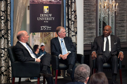 "DePauw University alums former Vice President Dan Quayle and civil rights activist Vernon Jordan Jr. were on hand to celebrate their alma mater’s 175th anniversary this week in New York City," reports the Indianapolis Star's Cathy Kightlinger. "Quayle -- who graduated from DePauw in 1969 and served as Vice President to President George H.W. Bush -- and Jordan -- who graduated in 1957 and was a close adviser to President Bill Clinton -- attended a reception and dinner Tuesday at the Waldorf Astoria in New York City." (photo: DePauw President Brian Casey moderated Tuesday's discussion)