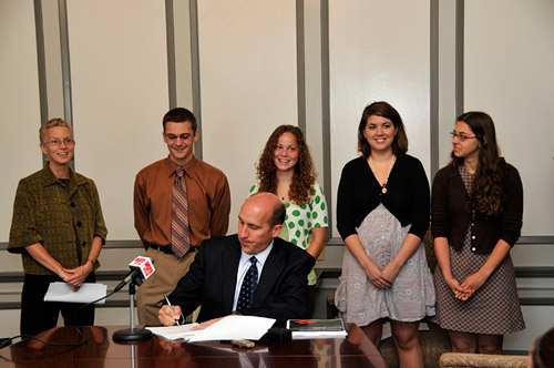 The story goes something like this: in 2008, when Brian W. Casey was selected president of DePauw University, a campus reception was held so that students and faculty members could meet him. At the reception, Baratta approached Casey and spoke with him briefly about why he should sign the American College & University Presidents’ Climate Commitment (PCC), an agreement to lower carbon emissions that other colleges had already joined. Casey handed Baratta his Harvard University business card – as Baratta tells it, his last one – and asked the freshman to stay in touch on the issue. It was the first of many interactions on the subject between advocates of the PCC and the new president. On Sept. 15, just two months after taking office, Casey added his signature to the PCC.