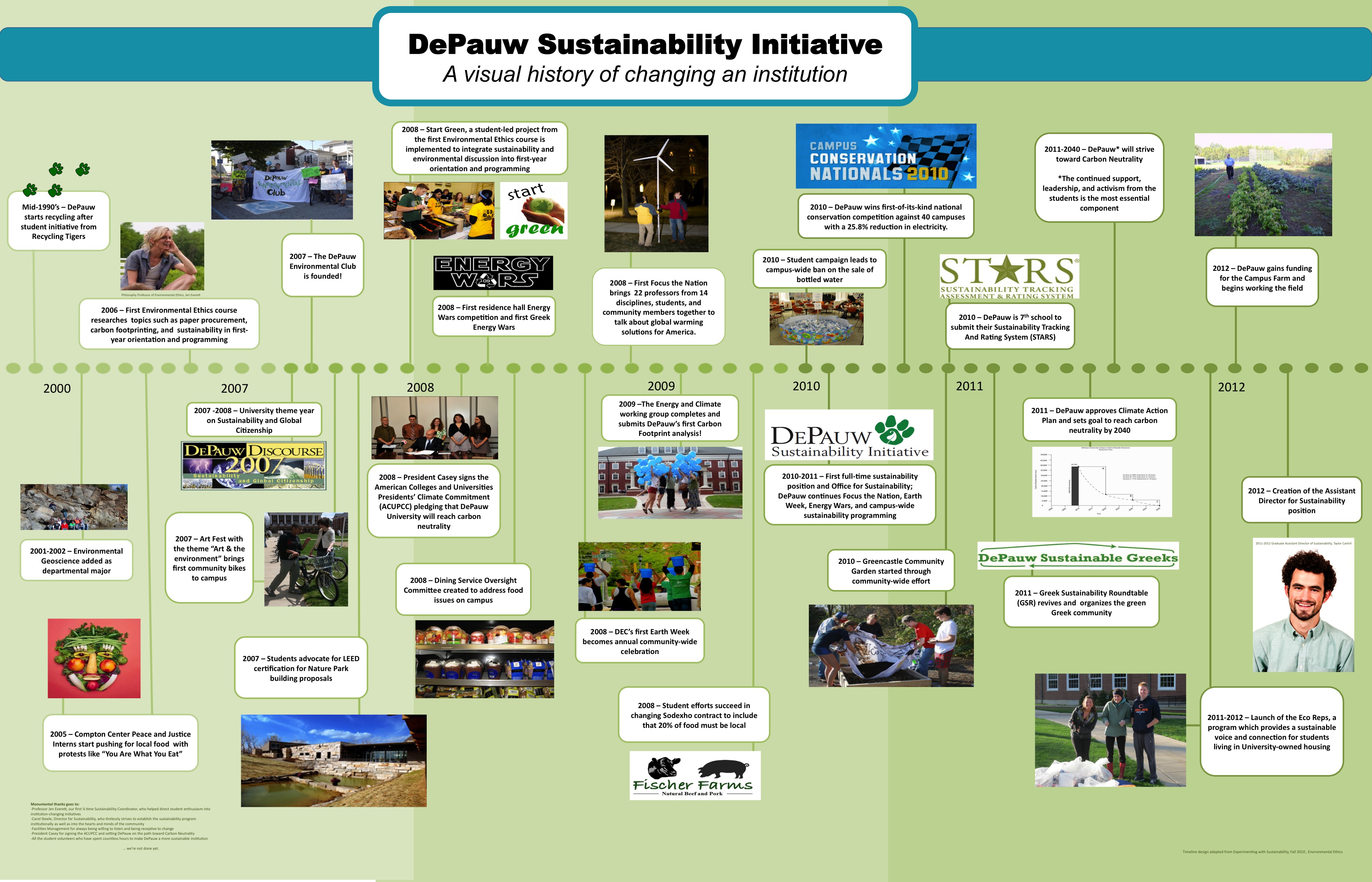 Read MoreAt DePauw University we are working hard to incorporate sustainability into everything we do. In 2008 President Casey signed the President's Climate Committment, setting DePauw on the path to carbon neutrality. In 2009 we became the first institution in the state to have 2 LEED Gold buildings. In 2010 we won the Campus Conservation Nationals competition by reducing our electricity usage compared to forty other colleges and universities. In 2011 our Environmental Fellows program was created. Today, our Eco-Reps are busy preparing for spring projects, we're readying to plant the first seeds on the Campus Farm, and so much more (check out our photo timeline!). Feel free to contact us with any comments or questions, and please stop by sometime!