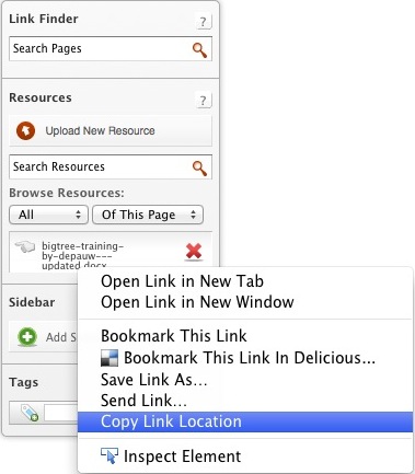 Once you've located the Resource in the right hand bar, you'll want to right click on the resource name. Choose "Copy Link Location" from your pop-up menu. (Please note, these instructions were written for Firefox users). This will copy the URL to your clipboard for later. (See example on right).