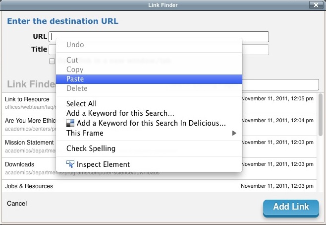This could also be accomplished by navigating to the link on the DePauw BigTree site (rather than the Admin screen) and locating the link. Right click the link then choose "Copy Link Location" from your pop-up menu.