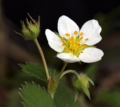 Fruit is a small red berry, about 0.5 inch long, shaped like the familiar cultivated strawberry. Fruit is edible, sweet.