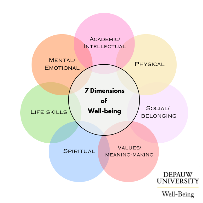 Counseling Services is an active member of the Well-Being Collaborative. This collaborative was created with the goal of fostering a cohesive campus culture around well-being, utilizing a holistic framework. This definition and dimensions serve as the foundation for programs and practices designed to empower individuals and strengthen the DePauw community. By prioritizing well-being and infusing it into our collective work, we align with DePauw’s mission, vision, and goals, ensuring that our efforts support the holistic development of students, faculty, and staff alike. Together, we can nurture a campus culture that values and supports well-being as both an individual and collective responsibility.