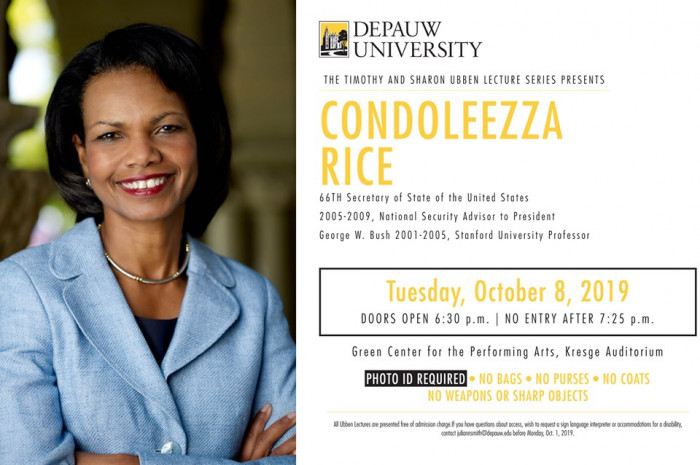 Those planning to attend Tuesday's Ubben Lecture by Condoleezza Rice should be aware that doors to Kresge Auditorium will close at 7:25 p.m., five minutes before the event begins. It is advised that guests arrive early to the venue, which is located within DePauw University's Green Center for the Performing Arts (600 S. Locust Street).