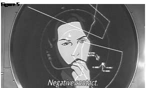 But the fact that this technology does transform its users is symbolically indicated by shots of one pilot from a viewpoint outside his plane; we must look back through the HUD so that the digital readouts now appear superimposed (in mirror image) on the pilot’s face (figure 6). The same shot is used in the controlroom sequence, where we gaze down at the operators from a position behind the wall-mounted display screens. The screens appear partly transparent to us, allowing us to see the operators, who appear behind the reversed readouts. This kind of shot is repeated throughout the film; again and again we see the characters through semi-transparent display screens, visors, and eyeglasses that flash with digital information. These shots force the spectator to look through this technology just as the characters do, and also become a central image in the film supporting the idea that, however transparent the technology, however subtle its mediation, it nevertheless alters us and our view
