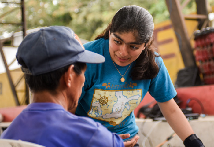 Above, Rubina Cheema ’23 assists a local man seeking medical care. Below, Jack Raffo ’22 inventories vitamins and drugs the medical team will use to treat patients.